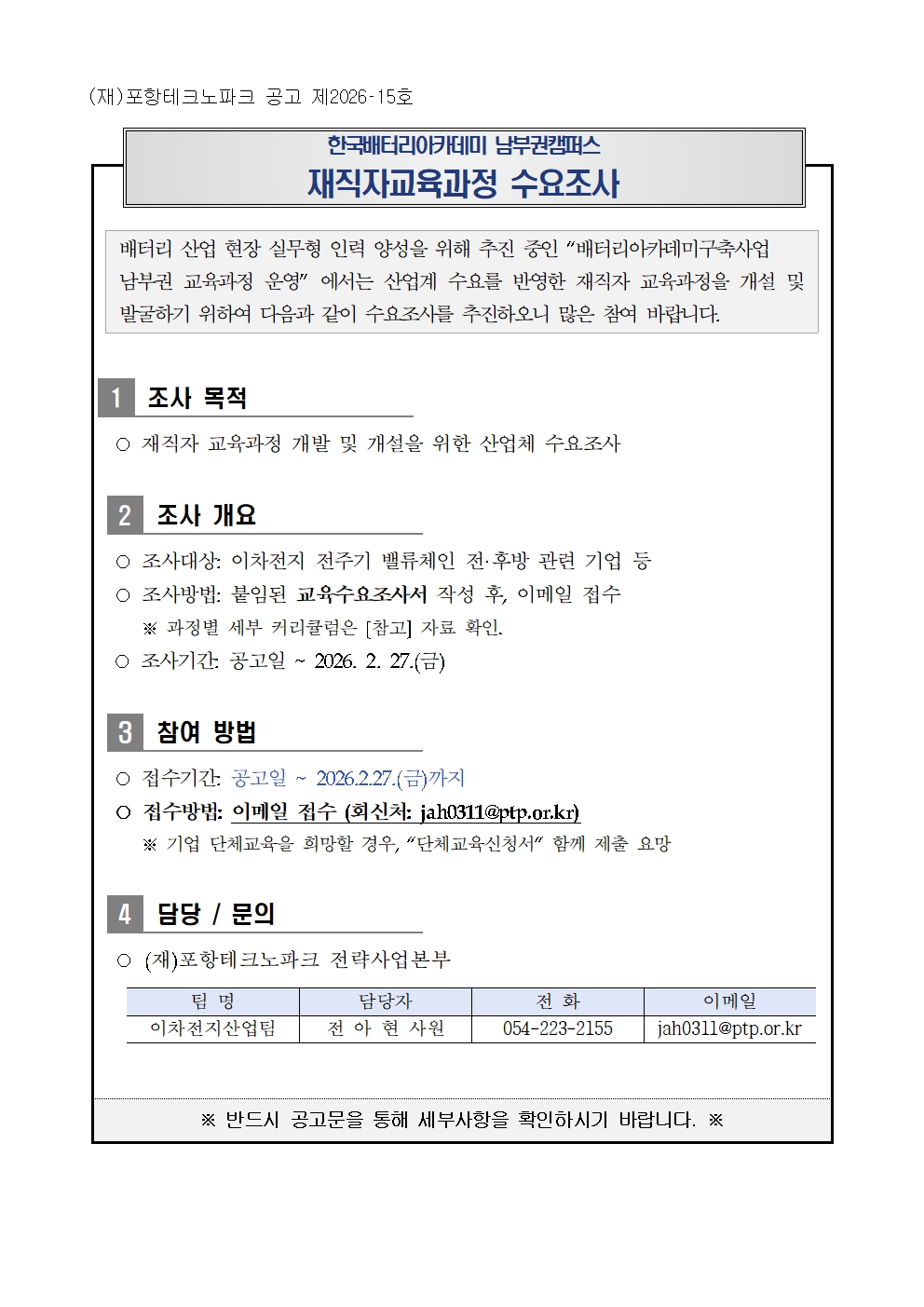 한국배터리아카데미 남부권캠퍼스 재직자교육과정 교육수요조사