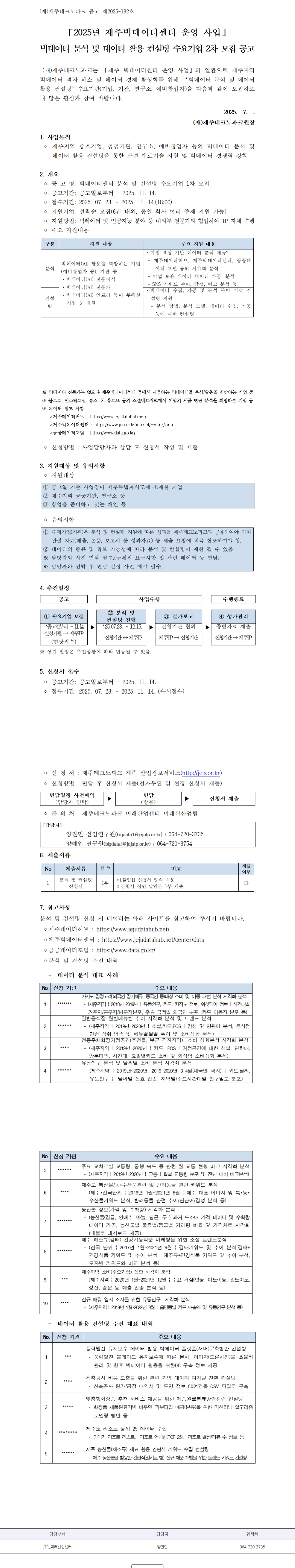 [제주] 2025년 2차 빅데이터 분석 및 데이터 활용 컨설팅 수요기업 모집 공고(제주빅데이터센터 운영 사업)
