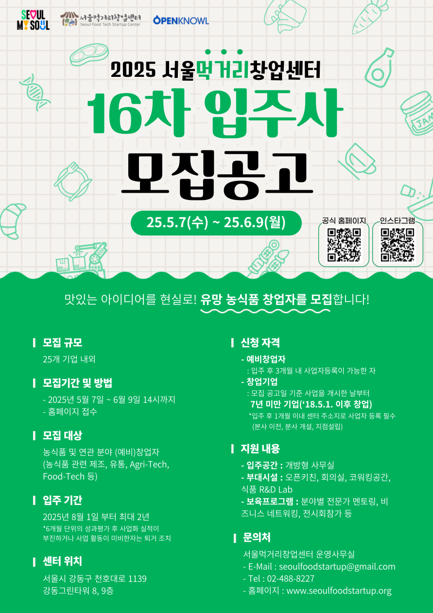 [서울먹거리창업센터] 16차 입주기업 모집 공고