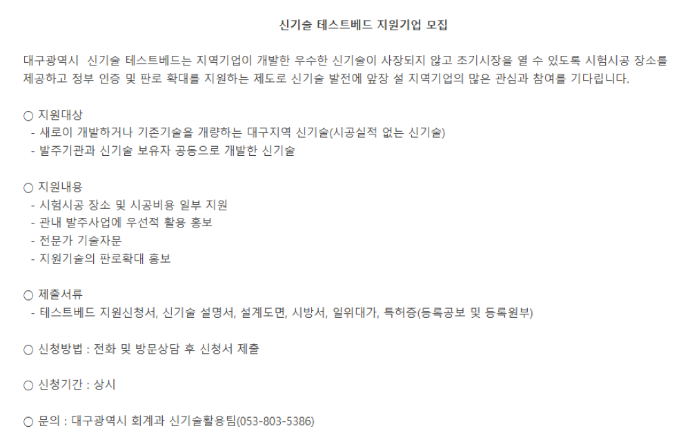 [대구] 신기술 테스트베드 지원기업 모집 공고