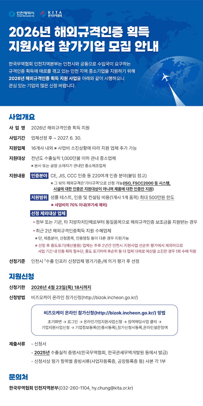 [인천시] 2026년 해외규격인증 획득 지원사업 참가업체 모집