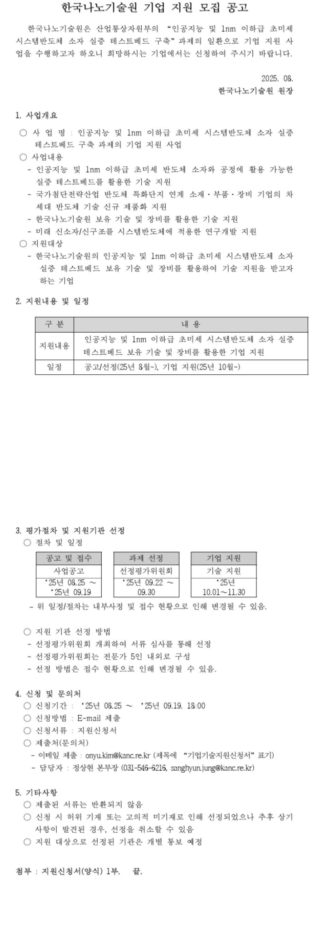 - 한국나노기술원의 인공지능 및 1nm 이하급 초미세 시스템반도체 소자 실증 테스트베드 보유 기술 및 장비를 활용하여 기술 지원을 받고자 하는 기업