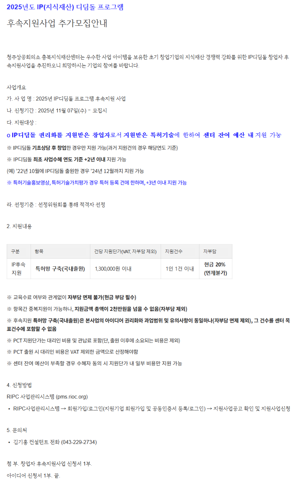 [충북] 2025년 IP디딤돌 프로그램 후속지원 추가모집 공고