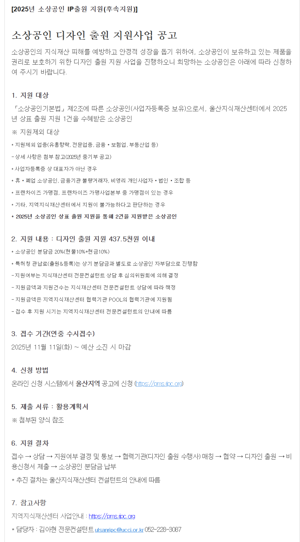 [울산] 2025년 소상공인 디자인 출원 지원사업 공고(소상공인 IP출원 지원(후속지원))