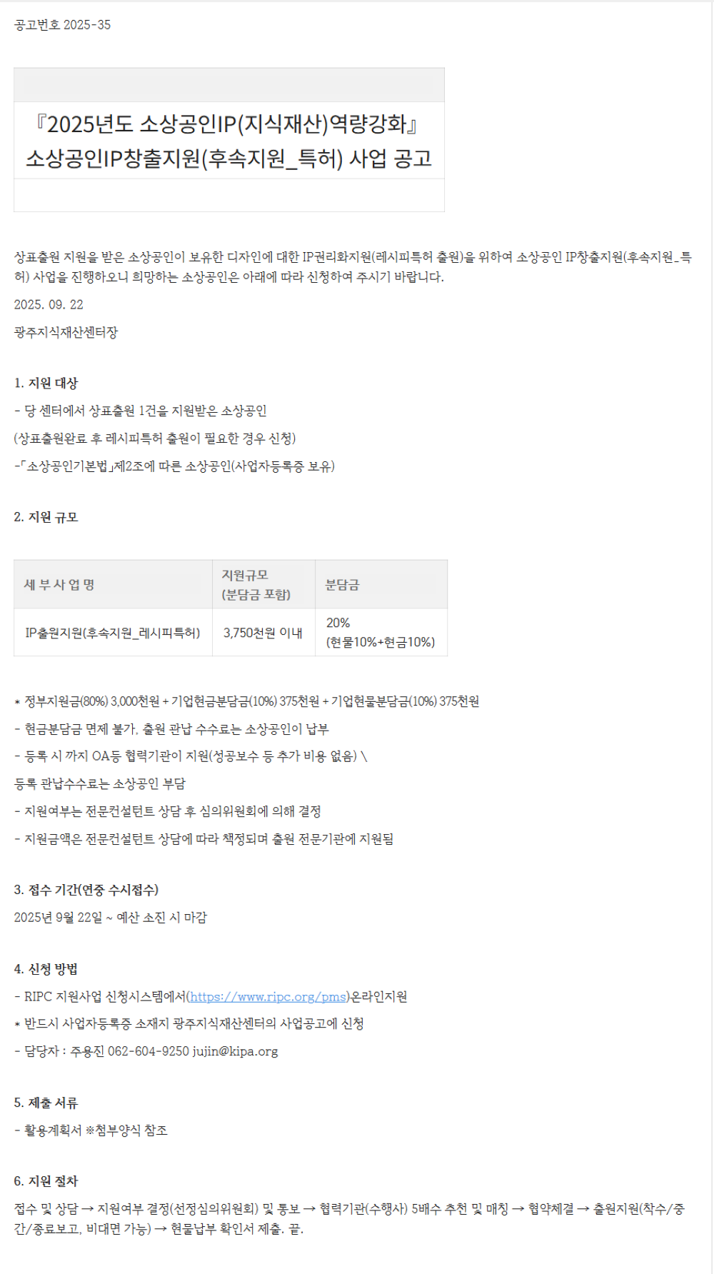 [광주] 2025년 소상공인IP창출지원 후속지원(특허) 사업 공고
