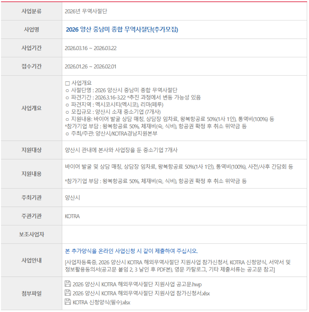 [경남] 양산시 2026년 KOTRA 해외무역사절단 참가지원사업 추가 모집 공고