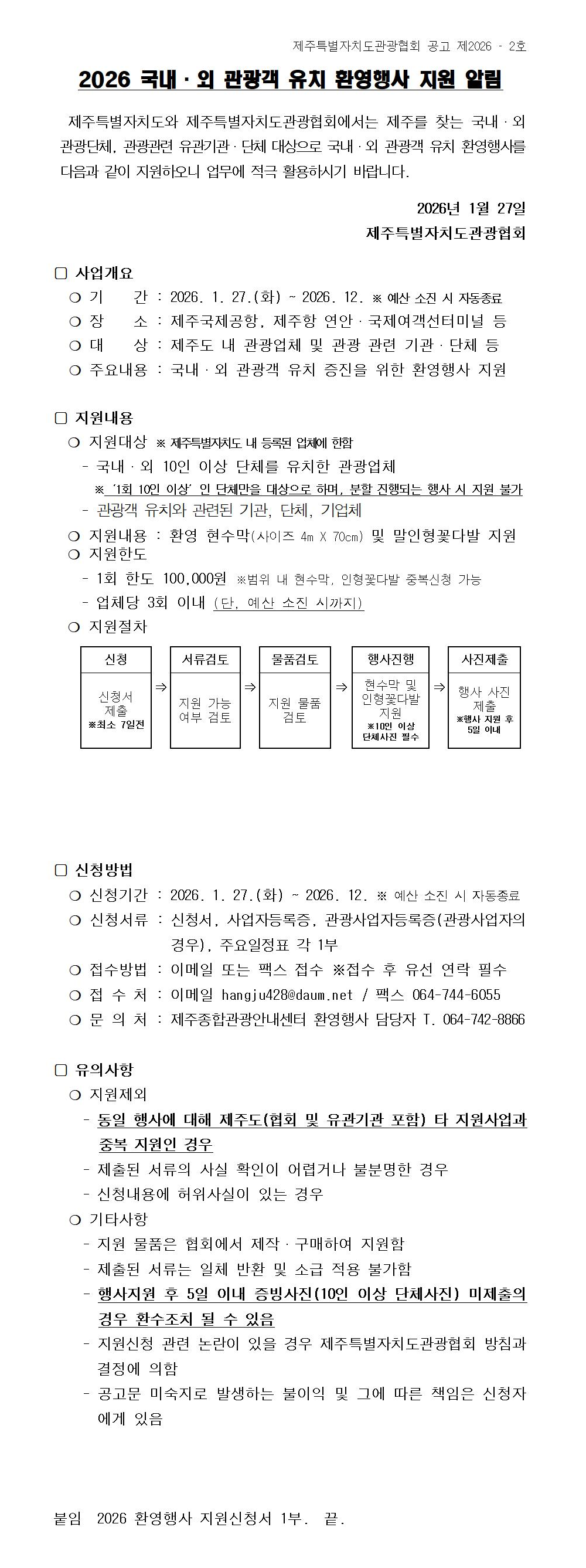 [제주] 2026년 국내ㆍ외 관광객 유치 환영행사 지원 공고