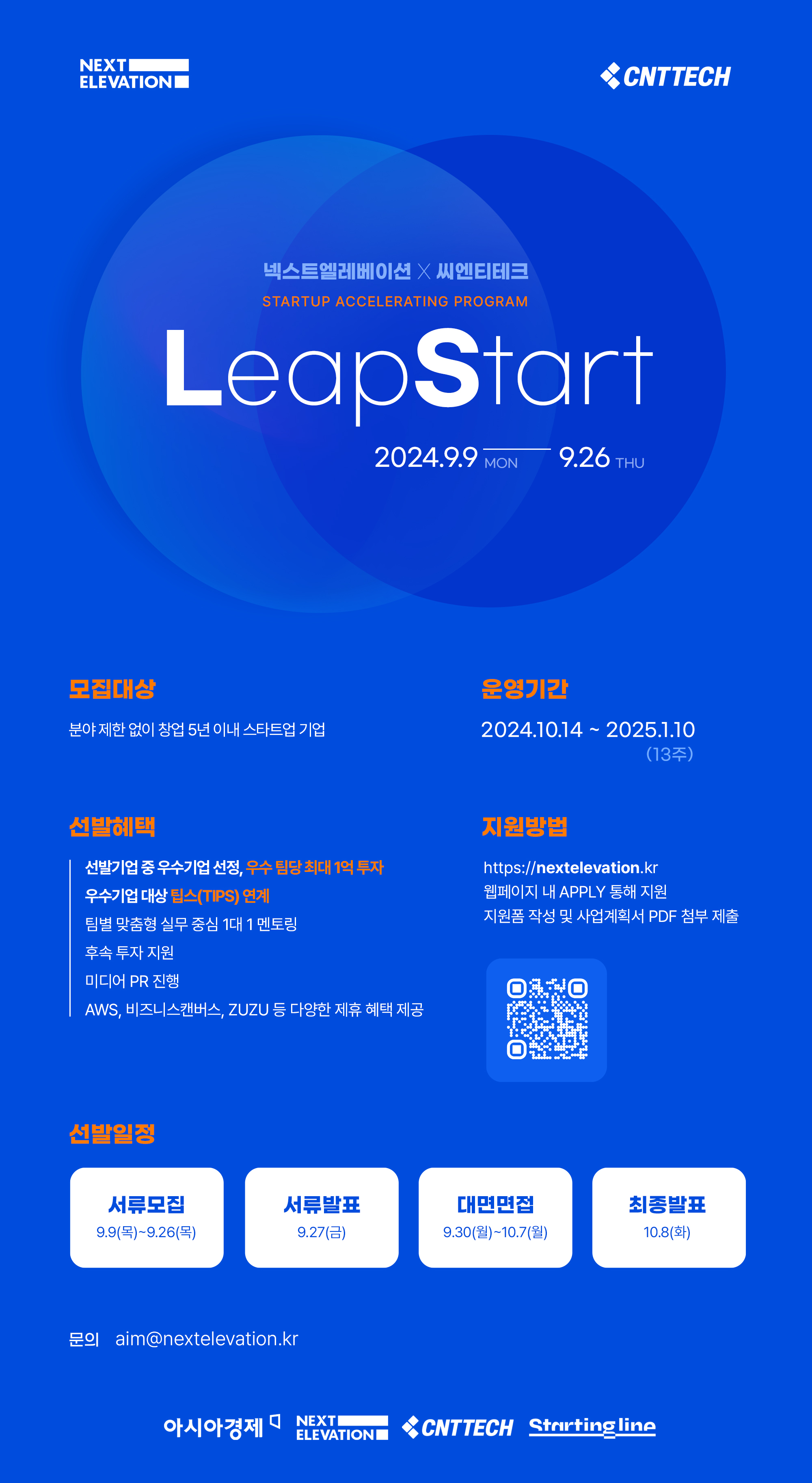넥스트엘레베이션X씨엔티테크 LeapStart 액셀러레이팅 프로그램 참여 기업 모집