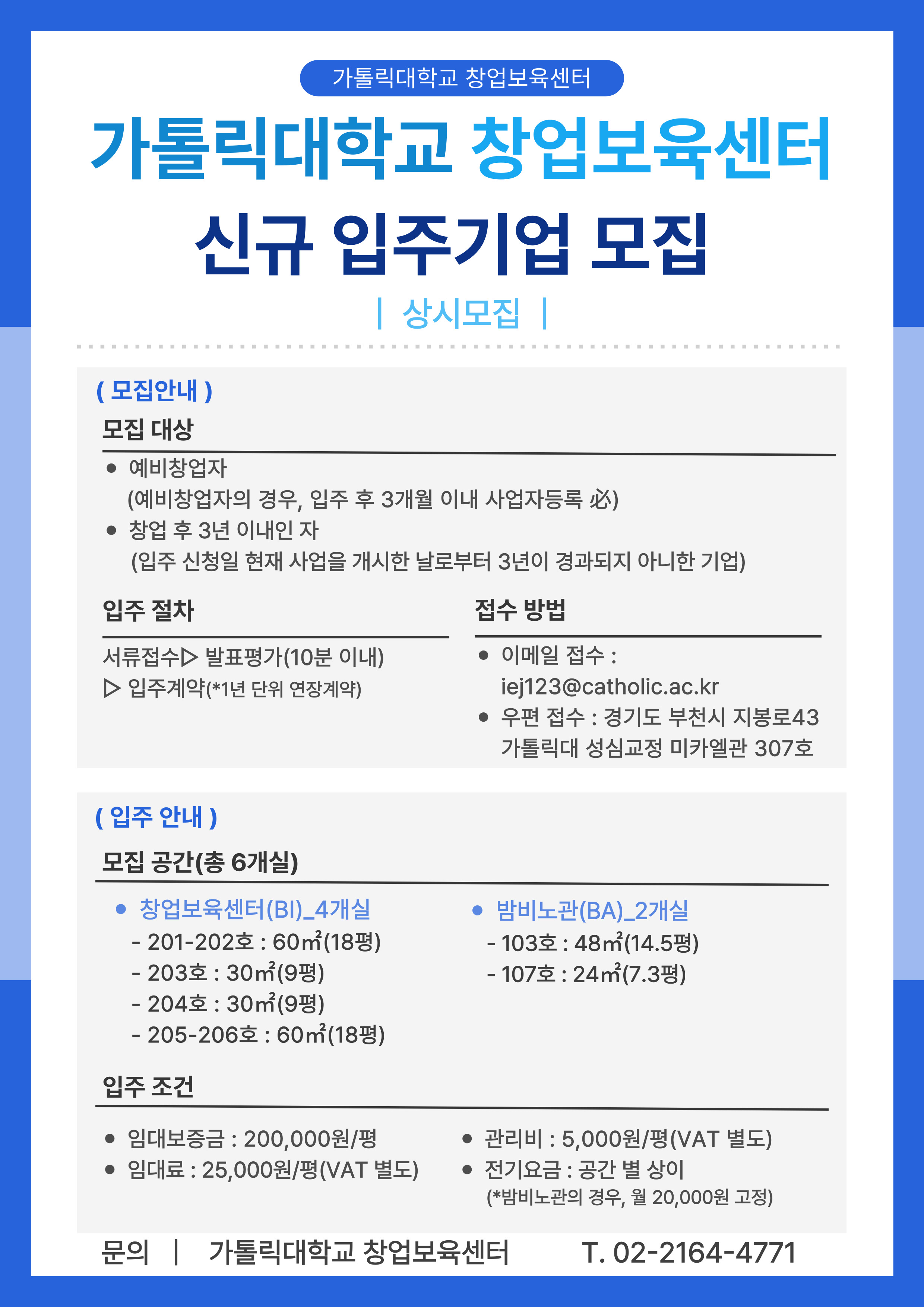 [가톨릭대학교 창업보육센터] 신규 입주기업 모집