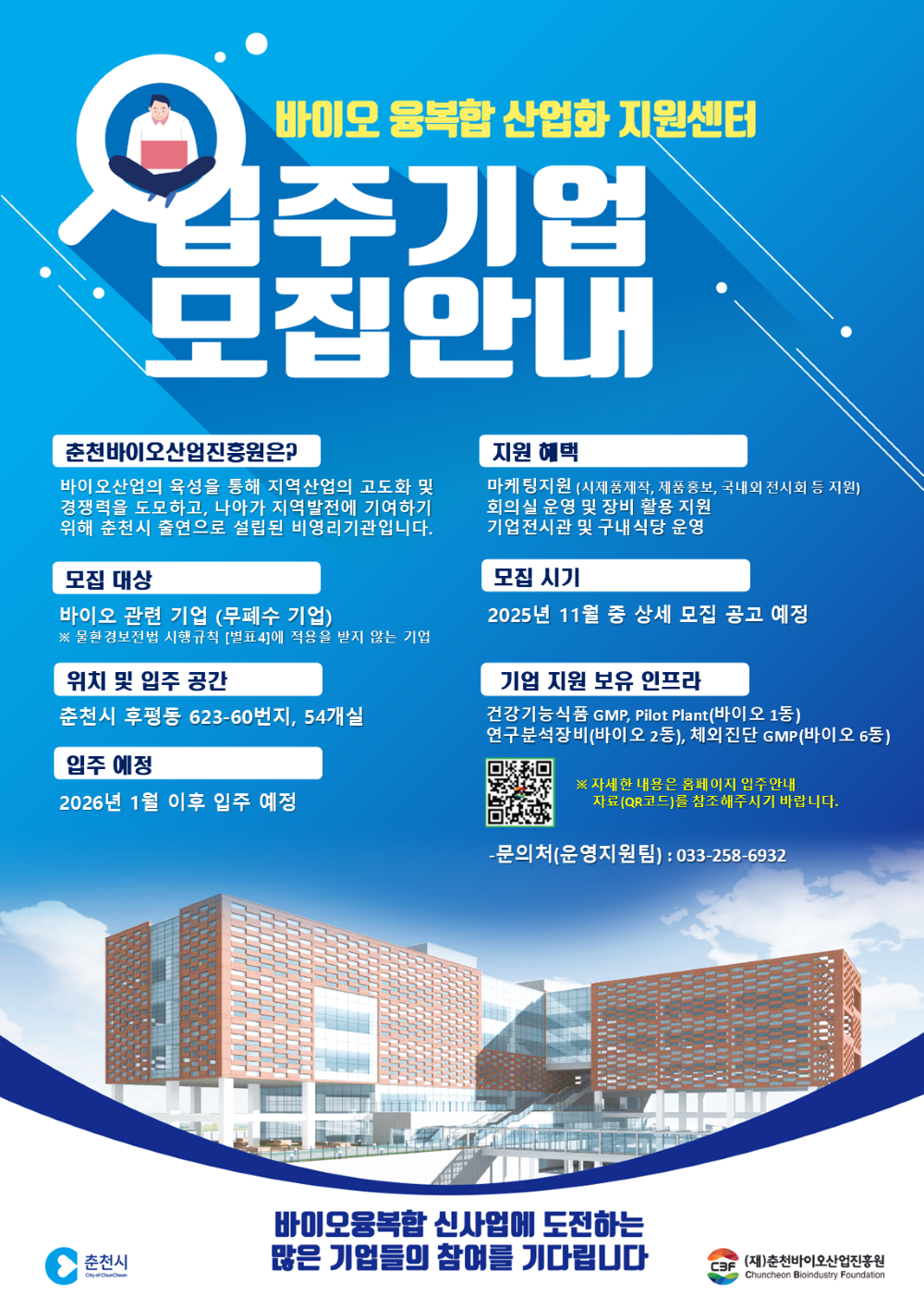 바이오 융복합 산업화 지원센터(바이오 7동) 입주기업 모집 공고