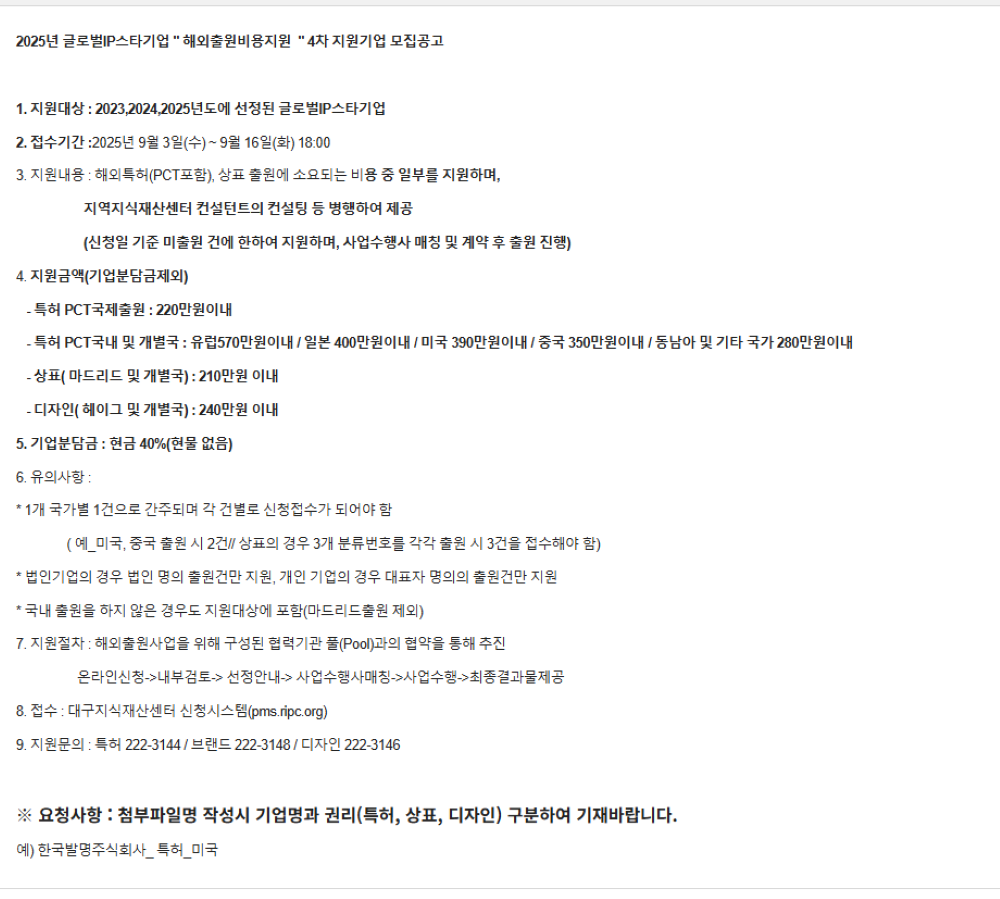 - 특허 PCT 국내 및 개별국 유럽 570만원 이내, 일본 400만원 이내, 미국 390만원 이내, 중국 350만원 이내, 동남아 및 기타 국가 280만원 이내